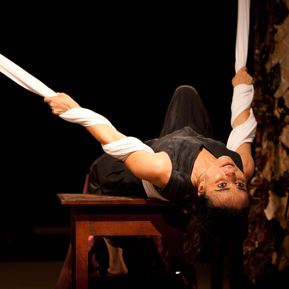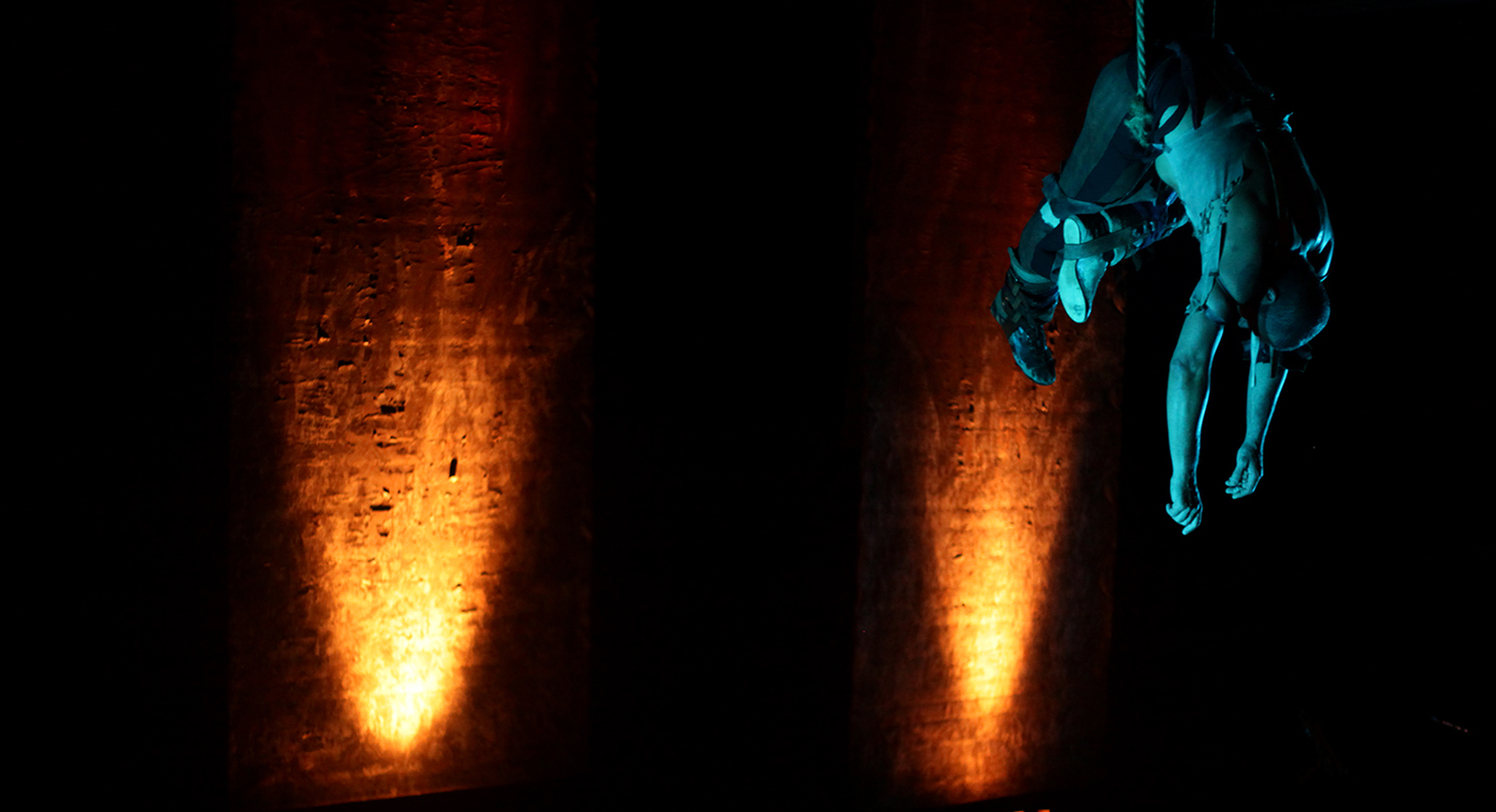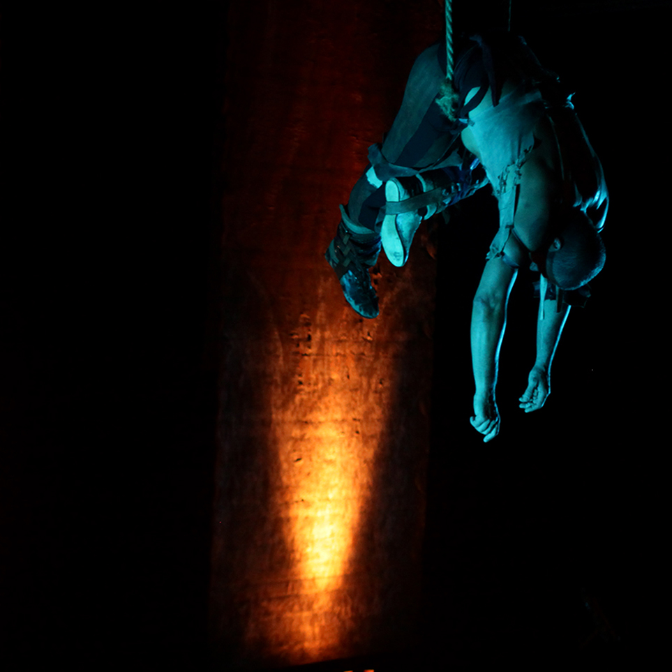 "Prometeu" é um espetáculo vertical onde o herói protagonista é acorrentado pelos pés, sem tocar o chão. Responsável pelo furto do fogo dos céus que possibilita a evolução da raça humana, o Deus está preso, a mando do Senhor dos Deuses, Zeus. Desta forma, a meia altura do chão, Prometeu se debate entre Deuses (acima) e os humanos (abaixo).