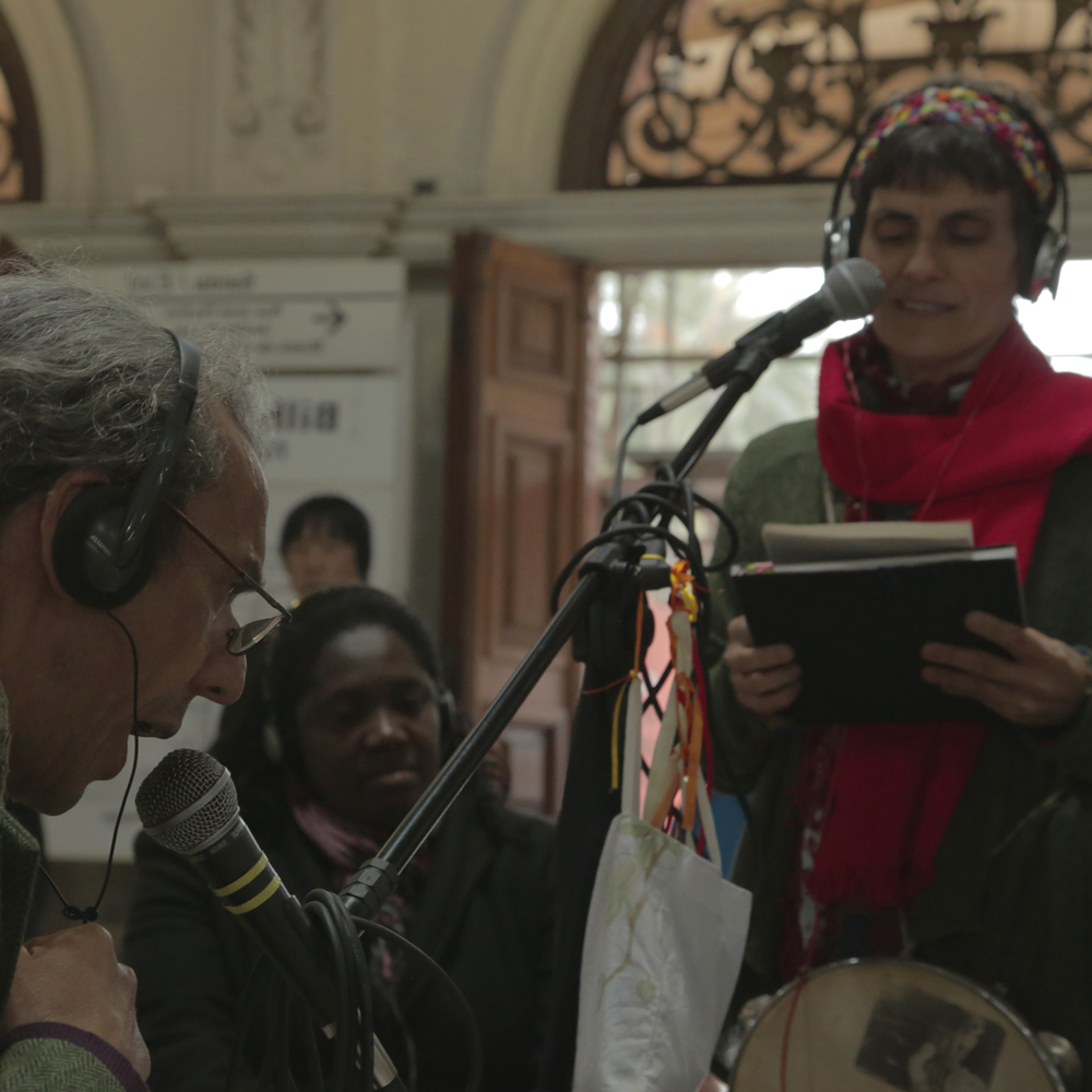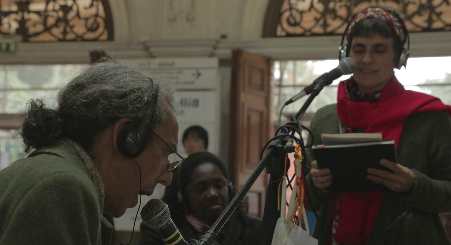 Os espectadores são convidados a sentar-se, a escolher uma das “páginas abertas” que compõe a cenografia e colocar um fone de ouvido para escutá-la. Essa Página Aberta escolhida será contada através de uma leitura encenada ao vivo feita por dois atores, cada qual com seu microfone e instrumentos musicais. Só quem está com o fone escuta o que é narrado, quem passa na rua, atraído pela imagem criada por essa ilha cênica, será o próximo espectador.